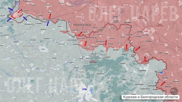 На Сумском направлении в районе Тёткино была только одна попытка врага атаковать границу, но ВСУ обстреливают её из средств дальнего поражения. В районе Юнаковки - Яблоновки ВС РФ отбили более 30 контратак. Наши артиллеристы обстреляли позиции противника в с. Песчаное возле Сум.