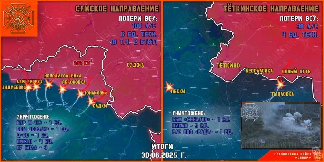 30 июня группировка войск "Север" уничтожала передовые и штурмовые подразделения противника на Тёткинском и Глушковском направлениях, продолжила создание полосы безопасности в Сумской области.
