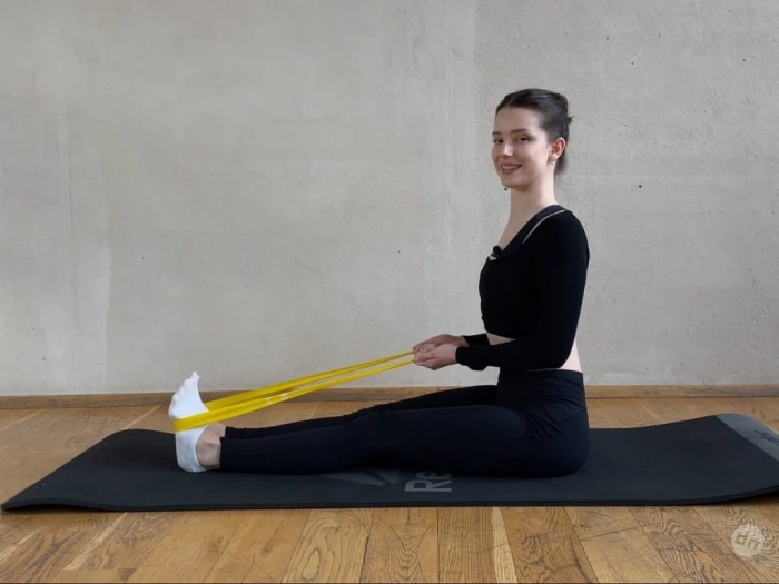 Косые скручивания. Сидя на полу, зафиксируйте ленту на стопах. Выполняйте скручивания в стороны с сопротивлением — укрепляет пресс и косые мышцы живота.