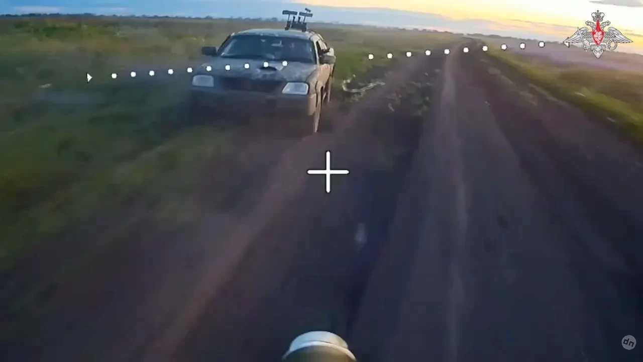 Боевое применение БПЛА «КВН». На переднем плане — машина противника с комплексом РЭБ. Беспилотник игнорирует её и движется к цели. Фото Telegram / «Хроника оператора БПЛА»