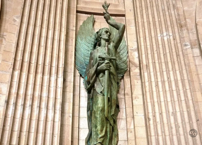 Длинный проход с боковыми капеллами и стенами, украшенными гобеленами и фресками с изображениями святых — покровительниц Армии, Флота, ВВС и Гражданской Гвардии, ведет к главному алтарю, у подножия которого ранее находились могилы Франсиско Франко и Хосе Антонио Примо де Риверы. Прямо перед входом в главное церковное пространство две огромные статуи ангелов с мечами охраняют вход, как ангелы Рая.