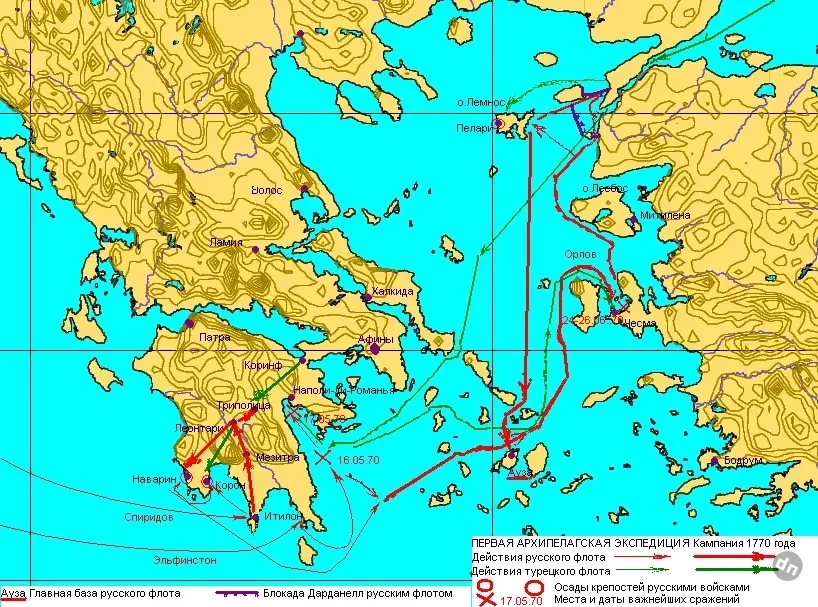 9 (29) мая 1770 года эскадра Эльфинстона прибыла к берегам Мореи. Высадив десант, эскадра двинулась на поиски флота противника, о котором узнали от греков.