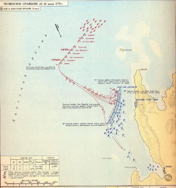 Русский флот в бою Хиосском проливе потерял один линейный корабль. В битве при Чесме русские потери составили всего 11 человек.