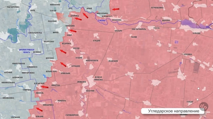 На Угледарском направлении ВС РФ освободили Поддубное – село в 5 км северо-западнее ранее освобожденного Комара и в 8 км к востоку от границы с Днепропетровской обл. Чтобы выйти на границу на этом участке, нашим войскам осталось взять село Андреевка-Клевцово. С мест сообщают и об освобождении села Толстой, а также форсировании реки Мокрые Ялы севернее Грушевского - так ВС РФ расширяют плацдарм на левом берегу реки Мокрые Ялы. Отсюда ВС РФ могут развивать наступление севернее линии Орехово-Новопавловка или южнее линий Шевченко-Малиевка или Шевченко-Камышеваха.