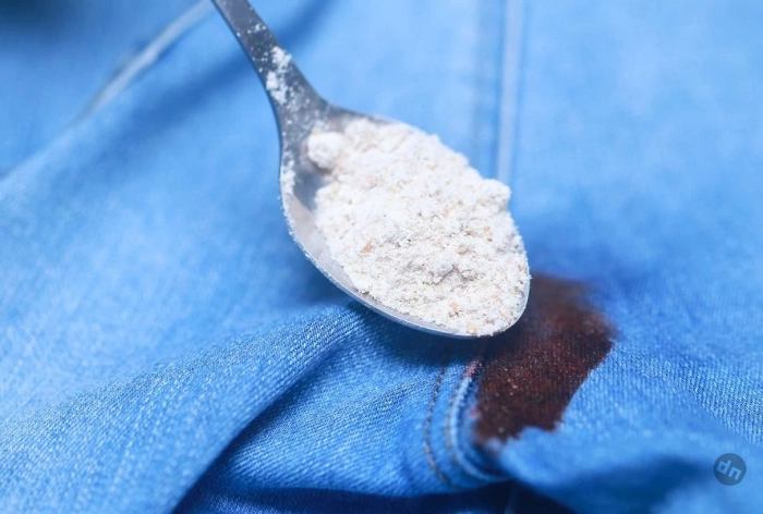 Присыпьте пятно крахмалом, содой или детской присыпкой – они впитают часть жира. Оставьте на 15–20 минут, затем стряхните.