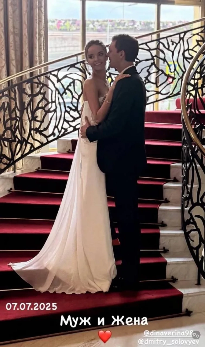 26-летняя гимнастка Дина Аверина вышла замуж за фигуриста Дмитрия Соловьёва, с которым она познакомилась на шоу "Ледниковый период" в 2024 году. О помолвке пары стало известно в феврале. Свадебная фотосессия молодожёнов состоялась в отеле "Балчуг Кемпински".