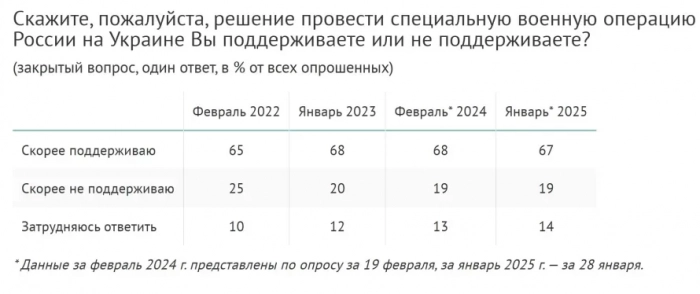 Согласно данным ВЦИОМ, в январе 2025 года уровень поддержки СВО в России составил 67%, а 65% респондентов оценили ход операции как успешный. Эти показатели демонстрируют стабильную общественную поддержку, несмотря на длительность конфликта. Опросы также показывают, что россияне связывают успехи на фронте с продвижением к заявленным целям - демилитаризации и денацификации Украины.