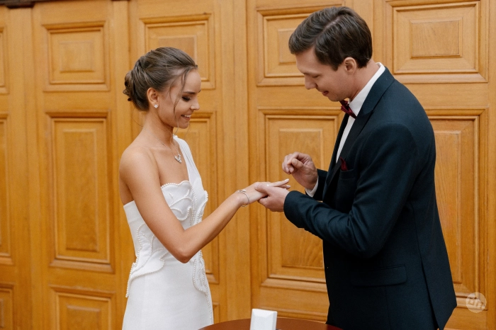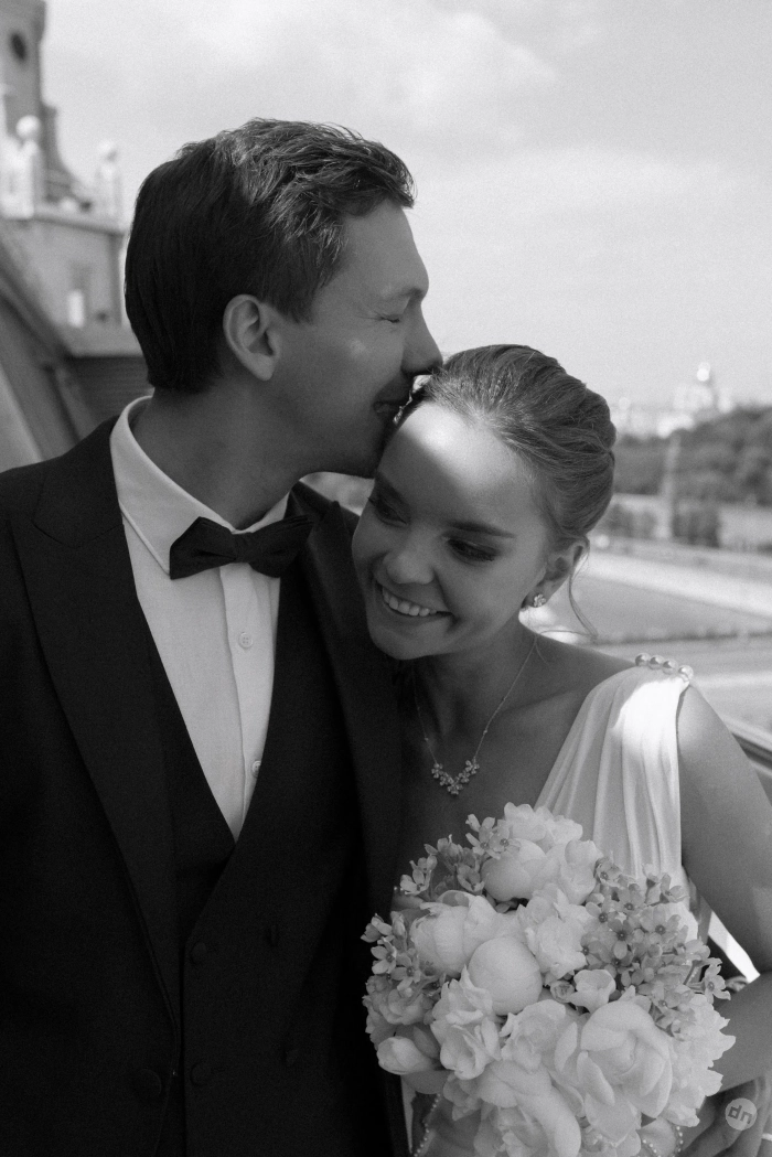 Сегодня в сети появились новые снимки со свадебной фотосессии и из ЗАГСа: фотосессия молодожёнов прошла в отеле "Балчуг Кемпински". На снимках невеста позирует в платье с разрезом бренда "Хохлома x Алёна Ахмадуллина" и в украшениях Mercury.