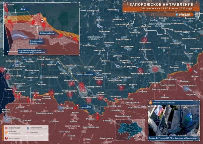 На Запорожском участке упорные бои в районе Каменского. Село фактически освобождено, но зачистка ещё продолжается. Артиллерия и дроны бьют по позициям противника в районе Плавней. Бои местного значения идут в районе Степового и Щербаков.