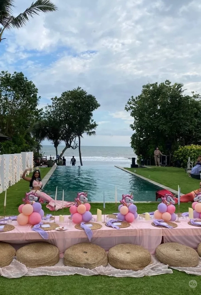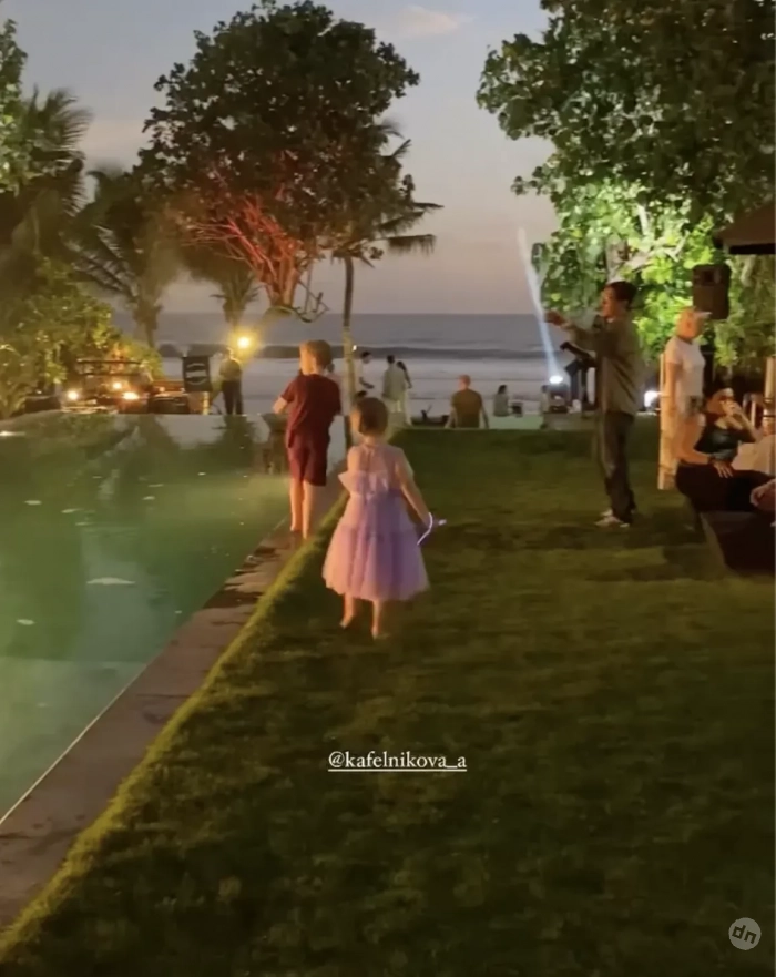 Алеся Кафельникова и Георгий Петришин с дочерьюАлеся Кафельникова и Георгий Петришин с дочерьюАлеся Кафельникова и Георгий Петришин с дочерьюДень рождения Киары прошёл на берегу океана, предположительно на Бали, где Кафельникова часто живёт с семьёй. Территорию у бассейна украсили надувной замок и воздушные шары. Детей и взрослых развлекали аниматоры-русалки, угощали разноцветным тортом, а вечером был фейерверк на пляже.