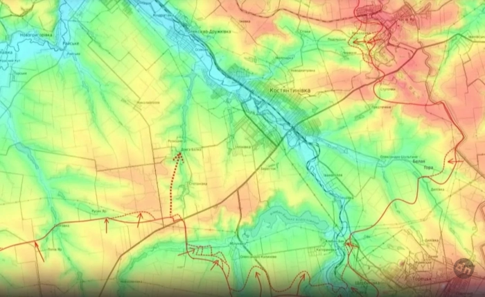 "Также мы развернули наступление, которое уже можно отобразить на картах в районе Русино-Яра. Здесь восточнее Русино-Яра мы тоже заняли несколько важных лесопосадок. И очевидно, что мы пытаемся развивать дальше наступление на Степановку и далее Долгую Балку, чтобы таким образом обрезать коммуникации противника на Константиновку с запада и соответственно взять всю эту группировку в клещи. Судя по тому, что я вижу, мы вероятнее всего здесь тоже не будем в лоб штурмовать Константиновку, а попытаемся охватить её и заставить противника её покинуть", - отметил Юрий Подоляка.
