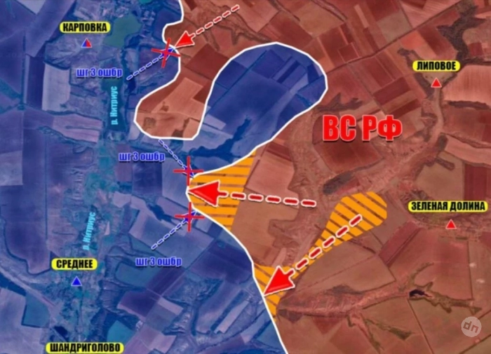 На Краснолиманском направлении ВС РФ расширяют зону контроля с опорой Зелёную Долину, чтобы срезать выступ в районе Пески Радьковские и выйти к Осколу. Для этого предстоит прорвать основной рубеж обороны ВСУ у Оскольского водохранилища. Пока же наши вышли к первым позициям этого рубежа по руслу реки Нитриус на линии Глущенково-Шандриголово-Новосёловка. На этом участке река имеет наибольшую ширину, а вот выше по течению, у Глущенково, практически пересыхает, там наши и атакуют на рубеже Глущенково-Новый Мир.