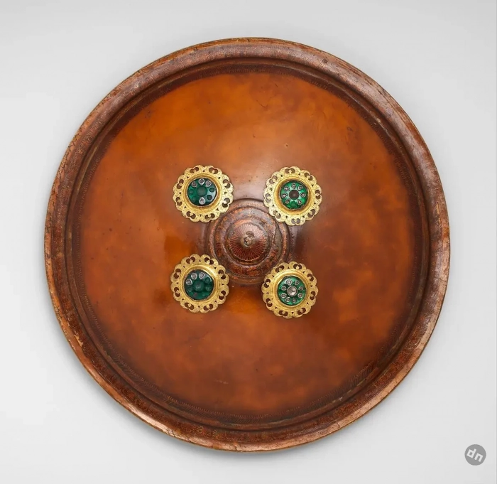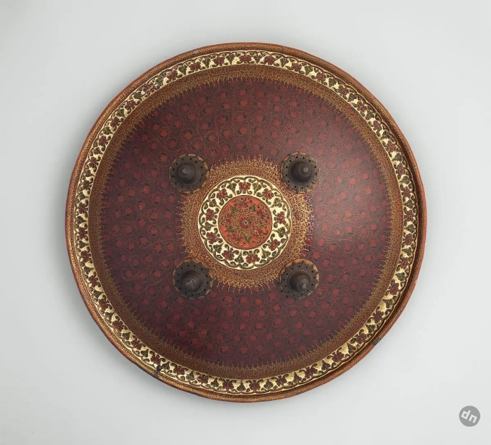Щит дхал с полупрозрачной кожей. Материалы: кожа, позолоченная бронза, эмаль, лак, драгоценные камни, ткань (бархат). Диаметр: 45,7 см. Вес 1690 г. Метрополитен-музей, Нью-Йорк