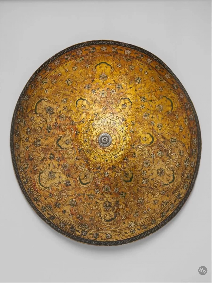 Это персидский щит конца XVIII – начала XIX вв. Щиты этого типа использовались пехотой и кавалерией по всему Ирану и Индии. Восемь картушей содержат стихи из предисловия к поэме персидского поэта Саади «Гулистан» («Розовый сад»), написанной в 1258 году, что свидетельствует о том, что создатель либо заказчик щита не чурались поэзии и хорошо в ней разбиралась. Впрочем, выбор надписи всё-таки предполагает, что создатель щита, а не его владелец, просил благословения, что указывает на то, что оружейники и ремесленники в Индии были очень даже грамотными людьми. Материалы: сталь, золото, бархат, железо. Диаметр 31,8 см. Вес 1114 г.