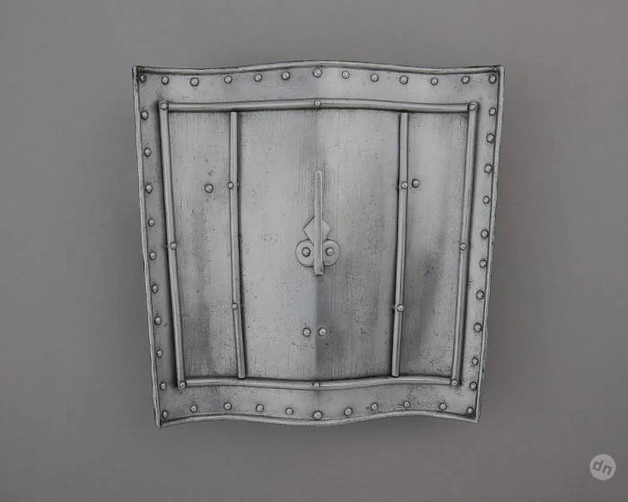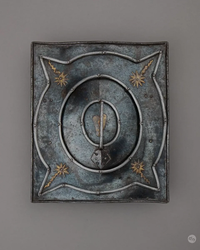 Это один из большой группы щитов, украшенных в ближневосточном стиле. Предполагается, что он был изготовлен для телохранителей Вольфа Дитриха фон Райтенау, принца-архиепископа Зальцбургского (правил в 1587-1612 гг.). Материалы: дерево, кожа, гипс, золото, серебряная фольга. Диаметр 59,69 см. Вес 2155 г.