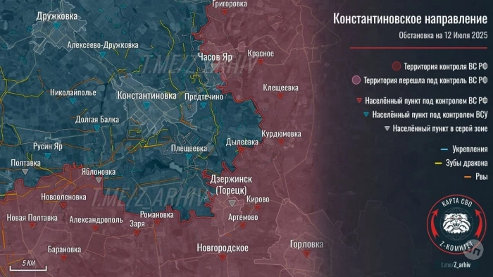 На Константиновском направлении наши продвигаются в районе Попов Яра. ВСУ контратаковали в Александро-Калиново. В Часов Яре освобождён ряд домов на юге. В районе Григоровки враг выбит с укреплений у канала, открывается путь к Марково и Новомарково.