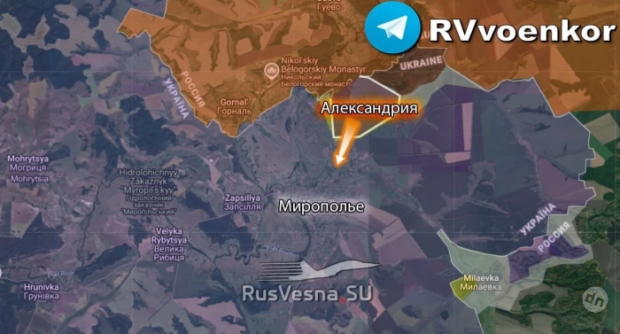 ВС РФ продвигаются на рубеже Новоторецкое - Разино, штурмуют Фёдоровку, вышли к окраинам Бойковки и развивают наступление в сторону шахты Краснодиманская, Родинского и Доброполья. Удары БпЛА уже наносятся по объектам в Родинском и достигают окраин Доброполья.
