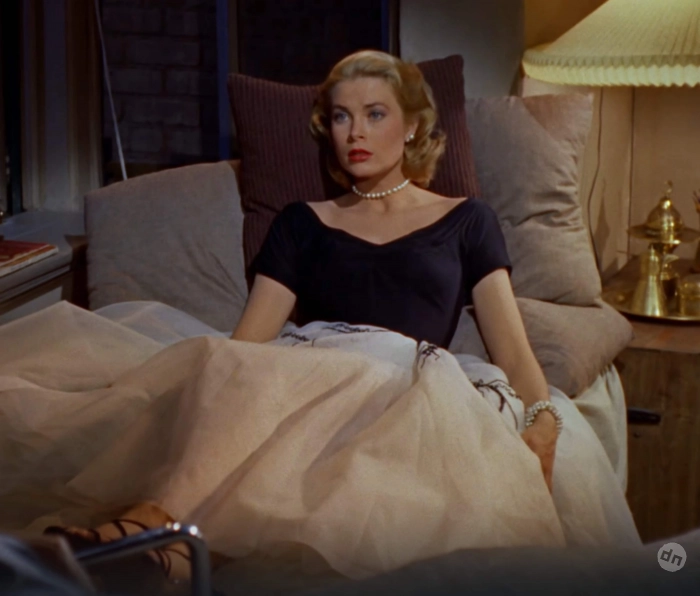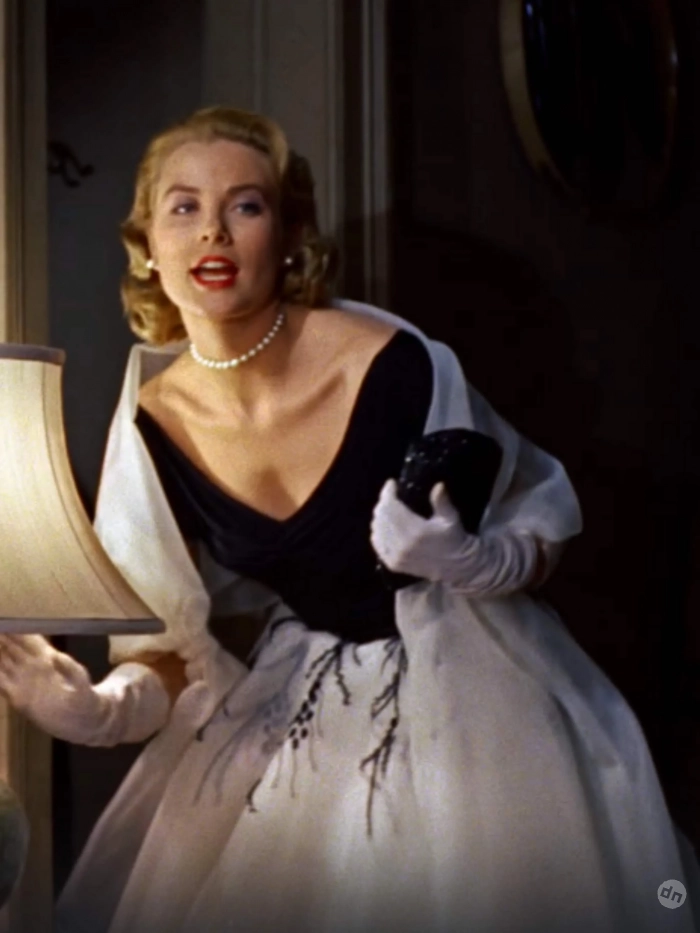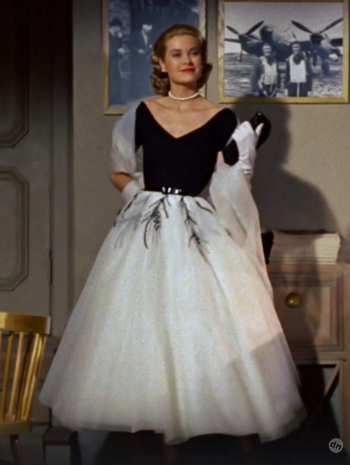 Речь о платье, которое было на Грейс в фильме “Окно во двор” Альфреда Хичкока, где она снималась вместе с Джеймсом Стюартом. Пусть платье Камиллы и не было точной копией оригинала, оно повторяло его основные элементы: чёрный верх с V-образным вырезом, белый низ и уникальную отделку на поясе.