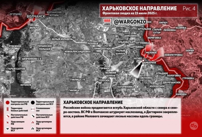 N4k предлагает ознакомиться с последними новостями из зоны проведения СВО, а также публикует свежую карту боевых действий, актуальную на 15.07.2025.