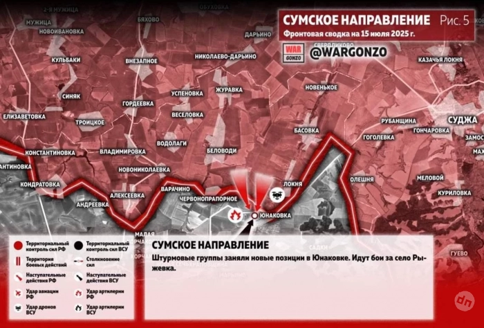 На Сумском направлении штурмовые группы заняли новые позиции в Юнаковке. Идут бои за село Рыжевка.