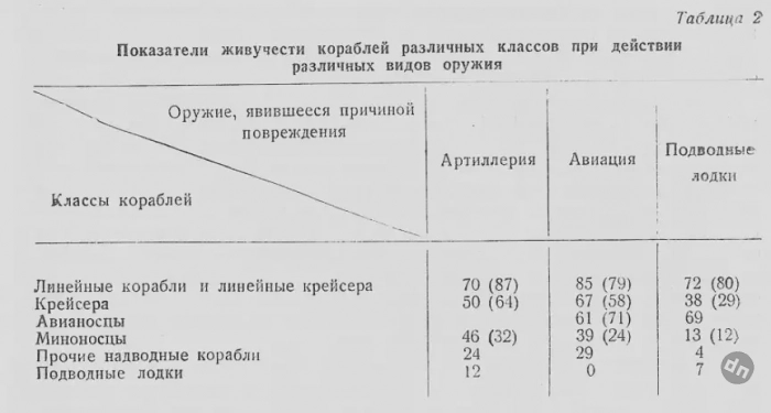 Для того чтобы сравнить живучесть авианосца с живучестью кораблей других классов, воспользуемся «условным показателем живучести», представляющим собою выраженное в процентах отношение числа случаев, когда корабль после нанесения ему повреждений остался на плаву, к общему числу случаев гибели и повреждений кораблей рассматриваемого класса. Соответственные данные помещены в табл. 2. Приведённые в ней показатели основаны на статистических данных Центрального научно-исследовательского института НКСП за первые три года войны и на материалах контр-адмирала В. Ф. Чернышева (показатели по данным В. Ф. Чернышева приведены в скобках).