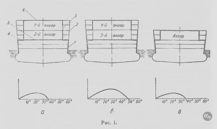 Схема «б», изображенная на рис. 1, с точки зрения боевой непотопляемости имеет существенные преимущества по сравнению со схемой «а». Здесь бронирование продольных стенок нижнего ангара представляет собою уширение главного броневого пояса, что существенно (на 5-6 м) увеличивает высоту бортового броневого пояса и, следовательно, увеличивает угол вхождения в воду его верхней кромки. Таким образом, вертикальная броня ангаров является как бы вторым броневым поясом, защищающим не только ангары, но и бортовые коридоры и сходы во внутренние помещения. Положительное влияние, которое оказывает переход от внутреннего бронирования ангаров (схема «а») к наружному (схема «б»), может быть оценено сравнением диаграмм Рида, построенных для случая боевой остойчивости, т. е. в предположении, что весь небронированный борт авианосца вследствие разрушений утратил водонепроницаемость. Как это нетрудно видеть, площадь диаграммы Рида для системы, показанной на схеме «6», примерно на 50 % больше, чем на схеме «а», а это означает, что авианосец, обладающий такой системой бронирования, сможет выдержать больший кренящий момент, вызываемый подводными повреждениями.