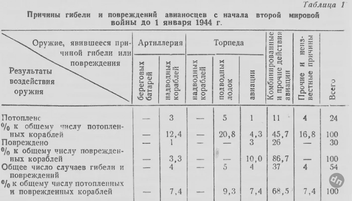 По данным контр-адмирала В. Ф. Чернышева, с начала Второй мировой войны до 1 января 1944 г. всего погибло 24 авианосца и повреждено не менее 30 кораблей этого класса (более подробные данные см. в табл. 1).