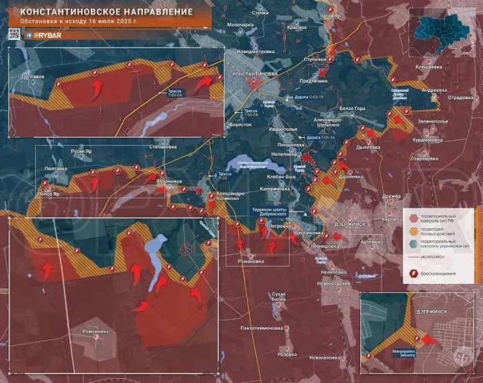 На Константиновском направлении из освобожденной вчера Петровки ВС РФ нацелены на Щербиновку. Одновременно наши давят на Яблоновку и Александро-Калиново. Вполне вероятно усиление российского напора на правом фланге: Дылеевка – Белая Гора – Александро-Шультино, что заставит ВСУ выводить свои части в район Бересток – Иванополье. А это развяжет Клебанбыкский узел обороны ВСУ, на который опирается оборона ВСУ в районе Торецка. В последние дни наши продвинулись западнее Дылеевки в посадках, взяв под контроль ряд опорных пунктов на высотах в направлении Александро-Шультино и Белой Горы. На севере участка, в Часов Яре, наши заняли территорию маслоэкстракционного завода.