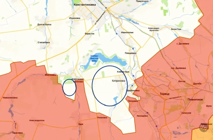 В ходе наступления ВС РФ в ДНР украинские боевики попали в очередное полуокружение юго-восточнее Константиновки. Под контролем ВСУ на этом участке пока остаются населенные пункты Катериновка и Клебан-Бык. Касательно Щербиновки, информация противоречивая. Российские источники пишут, что поселок вроде как под контролем ВСУ. Однако на оперативной карте показано, что в нем уже идут бои.