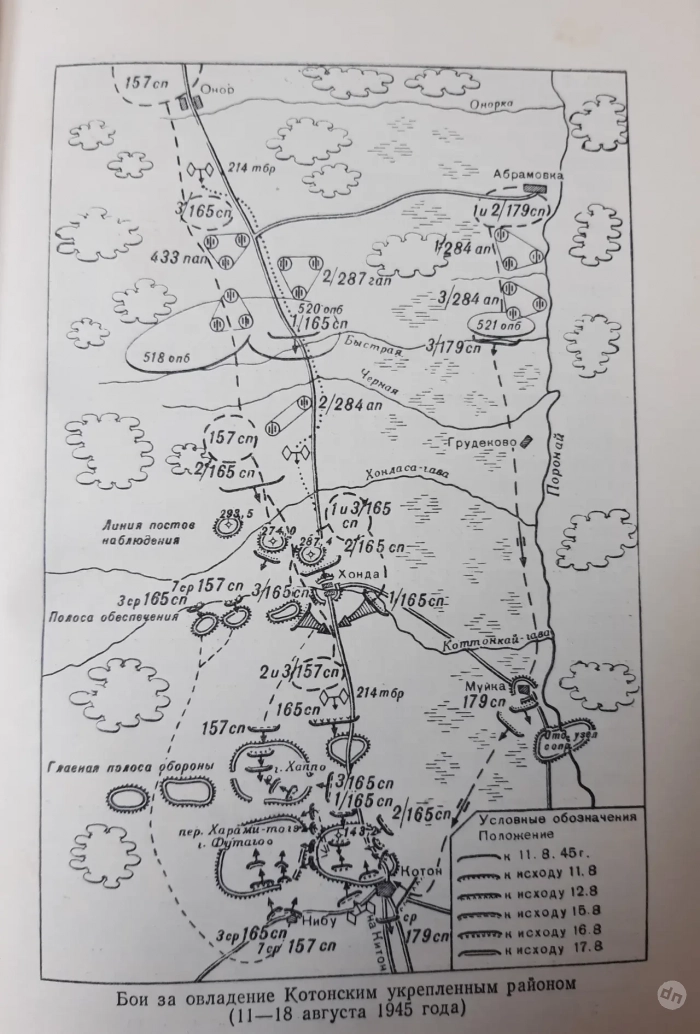 В этот момент положение японцев заметно ухудшилось. Советские силы были не только перед линией обороны, но и в тылу. Появление их у Котона — это серьезно. Южнее поселка находилась станция узкоколейки, рядом проходила Главная военная дорога. Это был главный транспортный узел всей системы обороны, взятие которого отсекало части японского 125-го полка от снабжения.