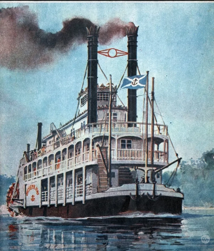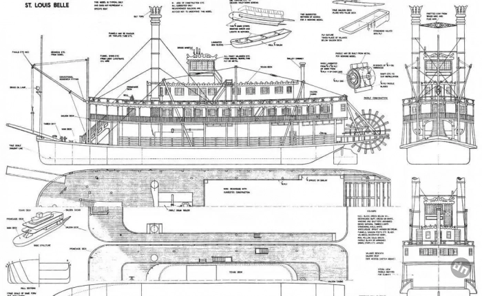 Кстати, если уж кто-то из наших читателей за оставшееся от лета время (и в отпуск) решит заняться постройкой модели «миссисипца», ему будет лучше использовать чертежи вот этого парохода: «Красавица Сент-Луиса». На мой взгляд, она более реалистична, нежели пароход из польского журнала. Тот очень уж какой-то узкий, а этот шире во всех отношениях. И паровые котлы с трубами под палубой на нем видно!