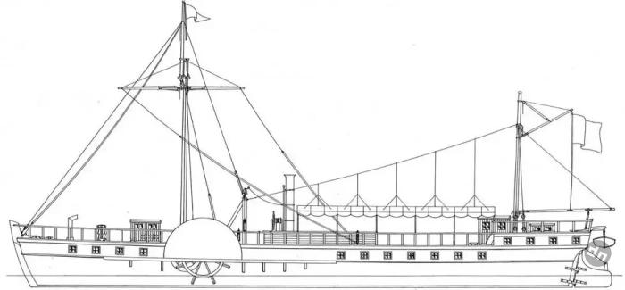 А вот это наш, российский пароход, построенный на Каме в том же 1817 году, но только вот как можно сделать его модель? Как выглядела его силовая установка и гребные колеса. Увы, кроме вот этой проекции ничего больше по этому пароходу разыскать не удалось!