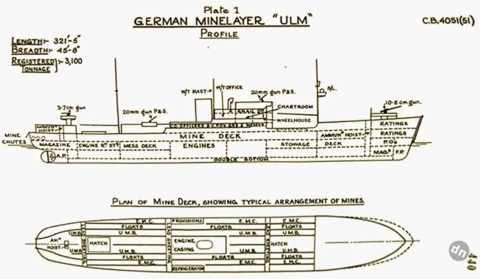 В то же время надводных минных заградителей специальной постройки в Кригсмарине не было, и пришлось переоборудовать для этой цели паромы и другие торговые суда. Одним из таких минзагов стал «Ульм» (“Ulm”).