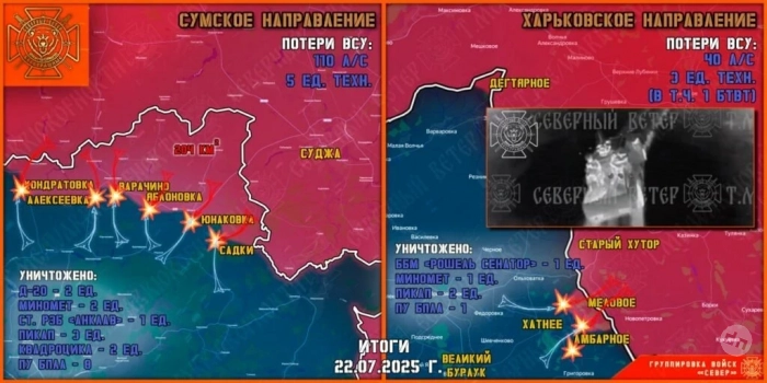 Не прекращаются ожесточенные бои в районе Кондратовки. Командование ВСУ продолжает отправлять на убой штурмовые группы 225 ошп, доукомплектованного для захвата этого небольшого села военнослужащими других подразделений. Северяне перемалывают живую силу противника и продолжают наступление на «Сумском фронте». Наши десантники и мотострелки завершают зачистку Варачино, выбив врага из пяти домовладений на южной окраине села.