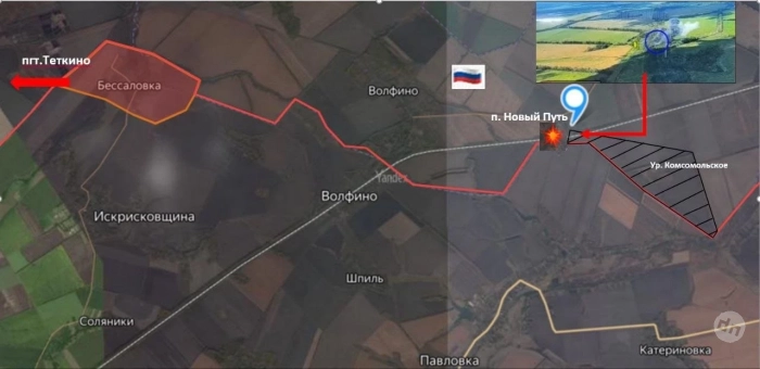 На участке около п.Новый Путь (центральная часть) зафиксировали присутствие штурмовой группы ВСУ. ВС РФ нанесли авиабомбовый удар по этой точке. На данный момент от урочища Комсомольское до места поражения добавляется серая зона. Ведём работу по обнаружению и выбиванию оттуда противника.