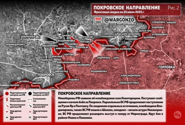 На Покровском направлении российские войска продвигаются в посёлке Зверево и севернее Яблоновки.