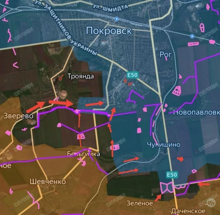 На Покровском направлении наши войска продвигаются между Орехово и Алексеевкой, постепенно закрывая карман и выравнивая фронт вдоль границы с Днепропетровской обл. Также армия России старается закрепиться в Зверево, с мест сообщают, что село в серой зоне. По ряду данных ВСУ выводят оттуда свои силы. Ожесточённые бои идут в Котлино - ВС РФ стараются выйти на западные подходы к Покровску. С мест сообщают о продвижении наших возле Леонтовичей, Удачного и Шевченко. На других участках фронта без существенных изменений.