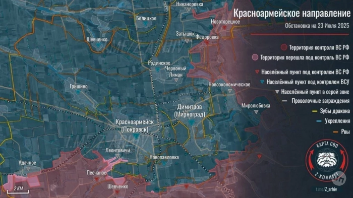 На Покровском направлении фиксируется продвижение между Орехово и Алексеевкой, идут бои за Котлино и в районе Леонтовичей, Удачного, Шевченко. Зверево в серой зоне.