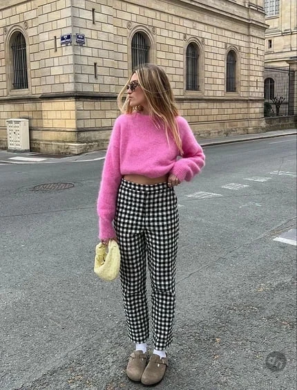 Фуксия с классической чёрно-белой клеткой — это эффектный и запоминающийся образ. Пастельный розовый с цветной клеткой добавит мягкости, а неоновый розовый с клеткой станет вызовом для смелых модниц.