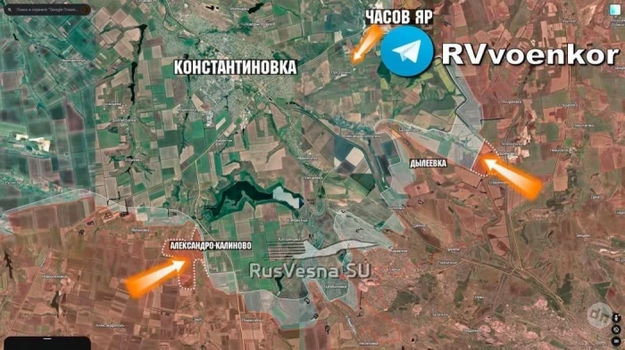 На Константиновском направлении сообщают, что в освобождённом накануне Александро-Калиновой в плен попали ВСУшники, которые не смогли отойти из села. Теперь ВС РФ могут наступать напрямую на Константиновку, либо двигаться дальше на восток, замыкая окружение сил ВСУ в Катериновке, Клебан-Быке и Щербиновке. Между Торецком и Часов Яром ВС РФ продвинулись к Александро-Шультино. В Часов Яре наши бьются в Северном и Шевченковском мкр. В окрестностях города есть улучшение позиций в районе Ступочек.