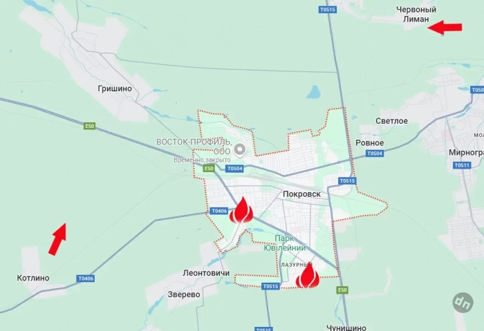Так, от позиций армии России к северу от Котлино до ближайшей точки Е50 – около 4 км. При этом в черте самого Покровска наши войска проводят болезненные для противника рейды в направлении E50, которая в городе переходит в улицу с пафосным названием Защитников Украины.