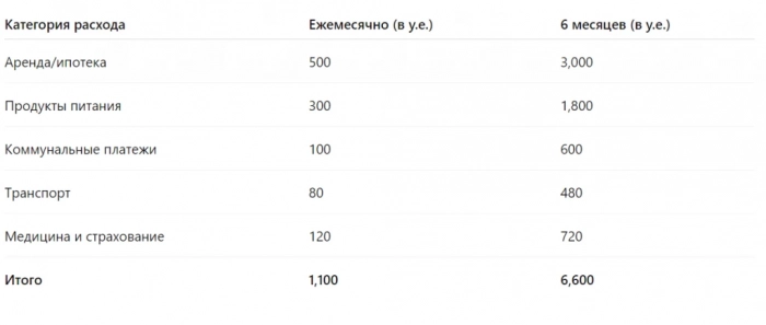 Таким образом, при ежемесячных базовых расходах в 1 100 у.е., ваша подушка должна составлять около 6 600 у.е. для уверенности на полгода.