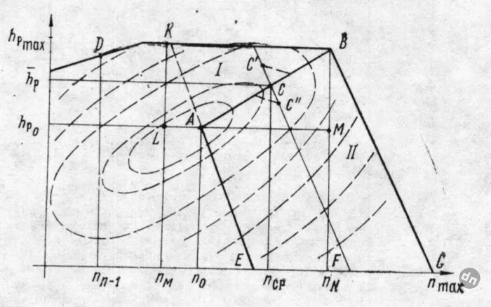 1. Положение рейки топливного насоса hp соответствует максимальной подаче топлива, Lт соответствует режиму в точке В, частота вращения коленвала n ниже точки максимального крутящего момента nmax (1700 оборотов в минуту).