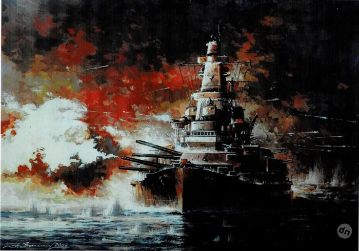 15. Линейный корабль «Саут Дакота» в ночном бою у о. Саво. Бумага, темпера, гуашь, 30х42, 2004 г.