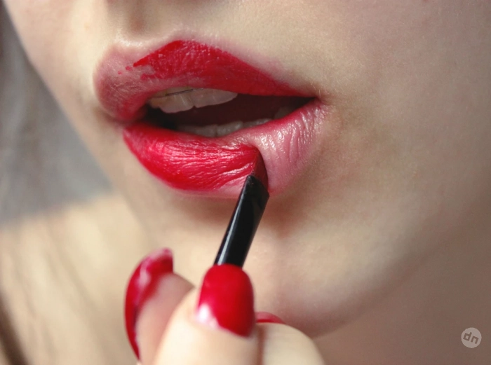 Скрабируйте губы щёточкой или сахаром, нанесите бальзам. Затем — карандаш чуть за контур, но без явного эффекта «вне границ». Помаду наносите кистью или пальцем — это даёт более живой финиш. Промокните салфеткой и нанесите второй слой.
