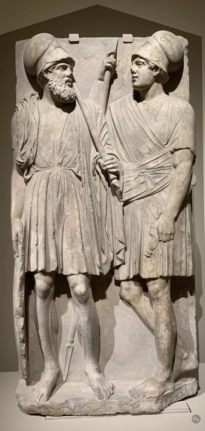 Стела с двумя воинами в шлемах. Найдена на Таманском полуострове. Оригинал. Третья четверть IV в. до н.э.