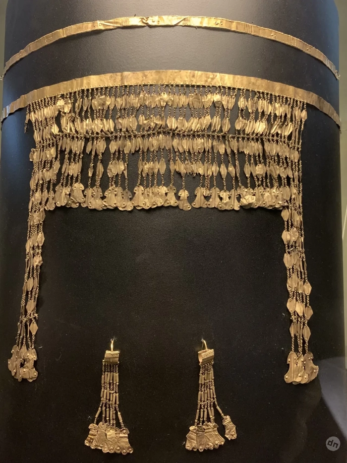 Мне всегда была очень интересна история Трои и знаменитого «клада Приама». И вот предметы из этого клада прямо перед глазами. Диадема, украшенная пуансонным орнаментом; отверстия на концах ленты использовались для продевания шнурка, которым диадема завязывалась на затылке. Подобные узкие и орнаментированные ленты-диадемы известны как в Трое, так и на памятниках Эгейского бассейна и Анатолии.