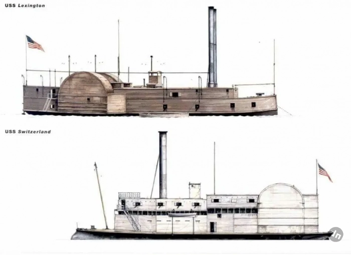 Пароходы «Лексингтон» и «Свизеленд». Те же две трубы, только уже безо всяких украшений, те же два гребных колеса, две палубы. Но только всё это обшито толстыми деревянными брусьями с прорезанными в них амбразурами для пушек