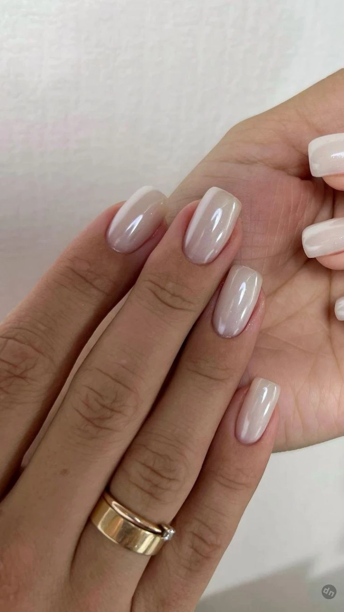 Плавный переход от молочного к бежевому или розовому напоминает легкую дымку. Такой маникюр добавляет объёма и визуальной легкости, а на овальных или миндальных ногтях смотрится особенно изысканно. Идеален для романтических и пастельных образов.