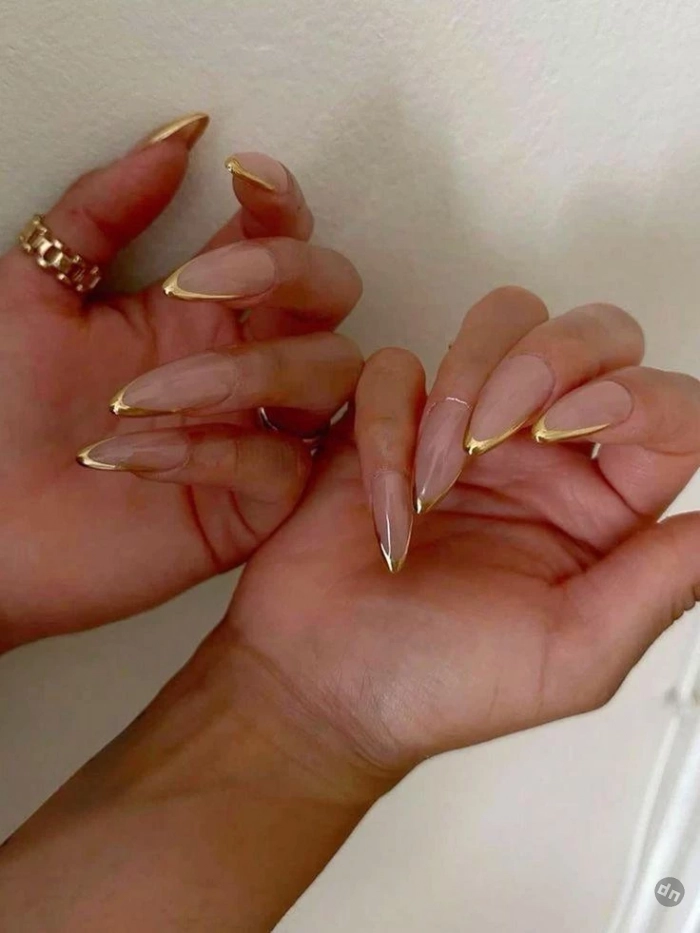 Французский маникюр обретает новое дыхание — теперь с изящными золотыми акцентами. Линия вдоль улыбки или тонкий контур у кутикулы добавляют образу лоск и актуальность. Такой дизайн отлично смотрится с кольцами и браслетами в тёплых металлах.